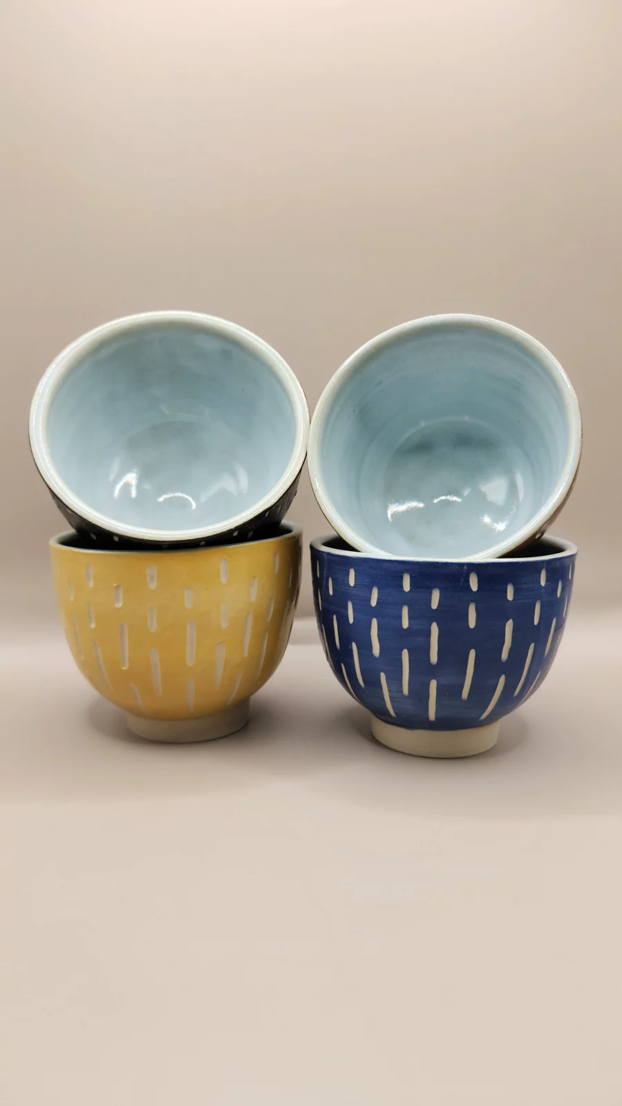 Je fais cuire les bols une première fois, lors de la cuisson de dégourdi, pour fixer l’engobe et le décor. Ensuite, j’effectue une deuxième cuisson à haute température avec l’email.