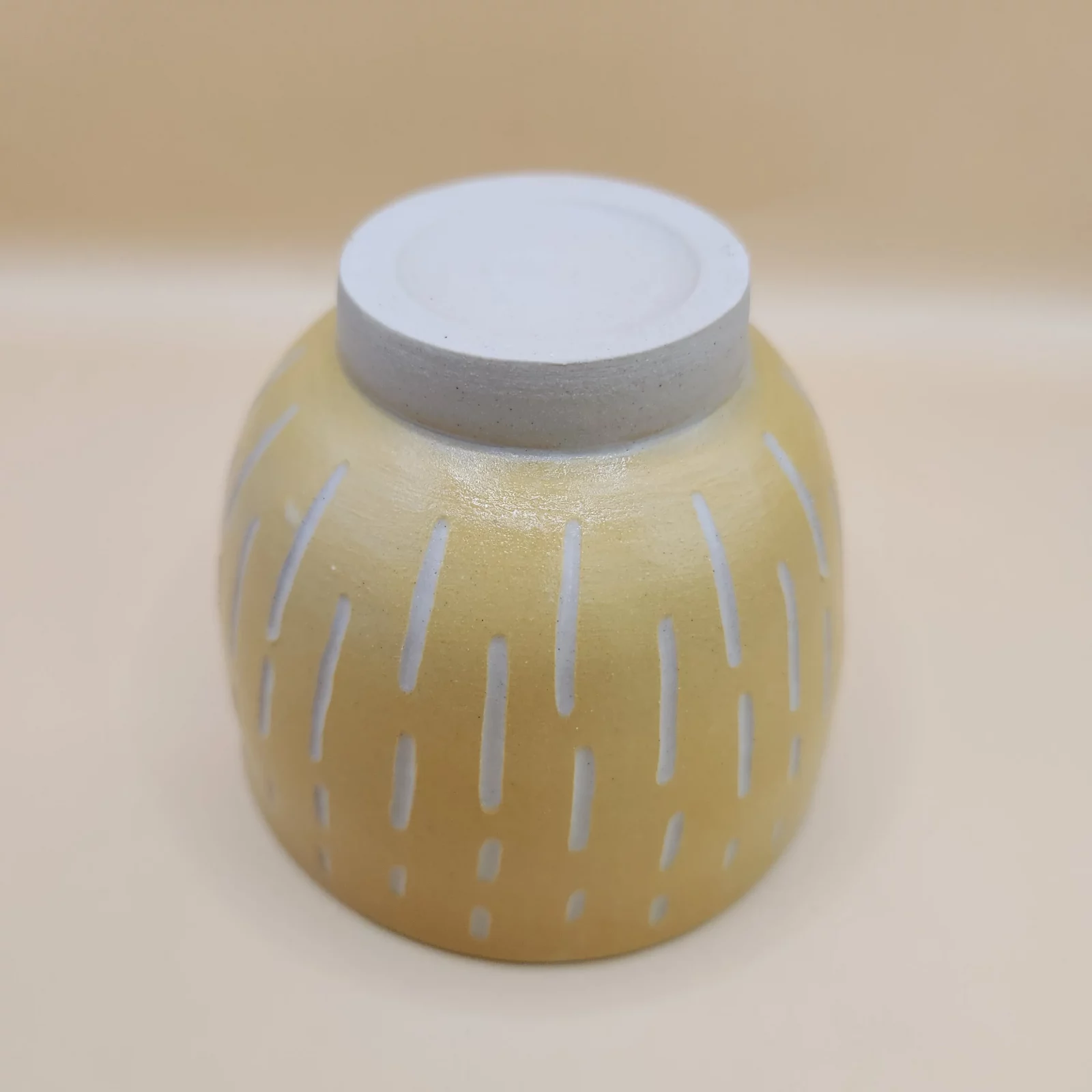 Une fois tournée, je laisse la pièce sécher jusqu’à ce qu’elle soit à consistance « cuir ». C’est-à-dire pas entièrement sèche, mais suffisamment ferme pour être manipulée sans se déformer. C’est aussi à ce stade que je la tournasse pour affiner les parois et travailler le pied du bol. - Application de l’engobe