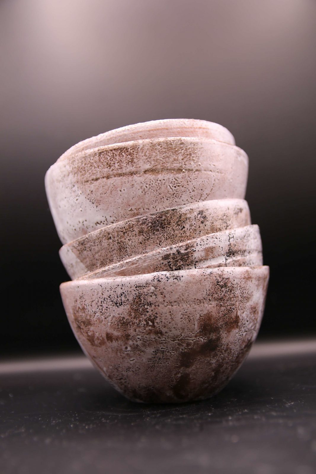L’enfumage crée des effets aléatoires sur la surface des bols. La fumée et les flammes laissent des marques plus ou moins marquées en fonction des matériaux utilisés et du temps d’exposition. Chaque pièce obtenue est unique, avec des nuances de gris, noir et brun qui varient selon la combustion.