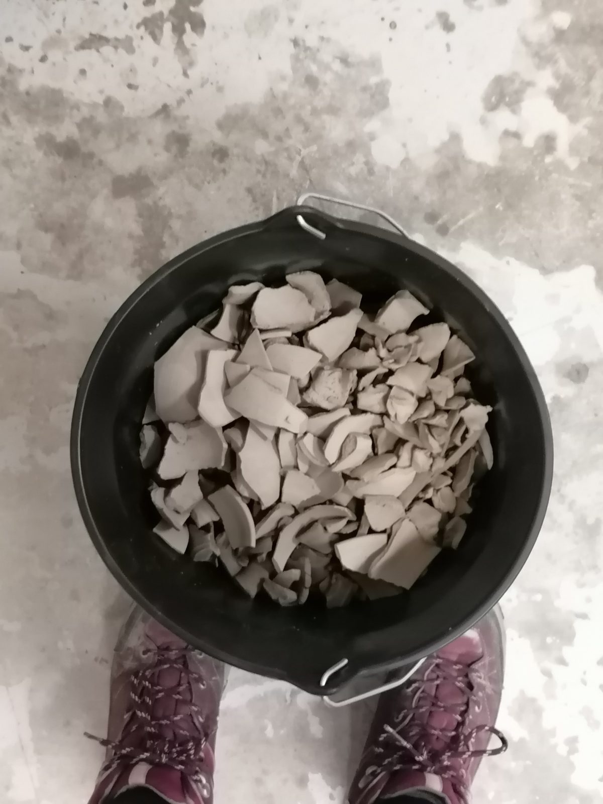 Commencez par laisser sécher vos pièces d’argile. L’argile sèche absorbe l’eau plus facilement et se désagrège rapidement. À l’inverse, une argile consistance cuire prendra beaucoup plus de temps à se dissoudre.